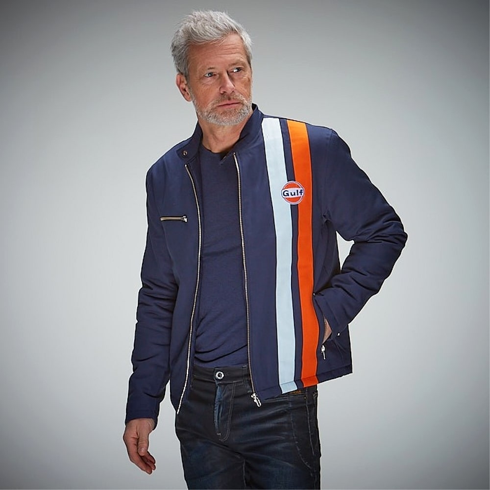 Canvas jacket made of the best cotton fabric with the classic racing stripes in dark blue and orange and the embroidered Gulf logo.