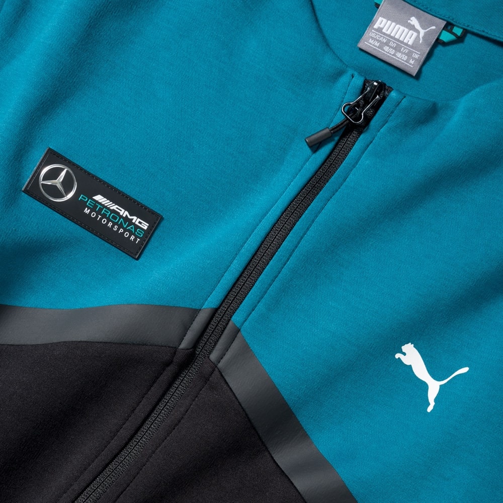 This is not surprising considering the design was inspired by the iconic T7 jacket by PUMA, and a MERCEDES AMG PETRONAS MOTORSPORT logo print as well as the PUMA Cat logo on the front perfect the look.