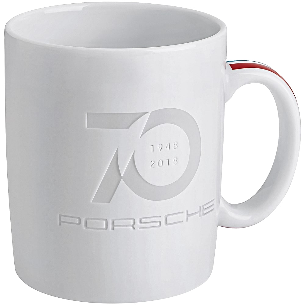 Porsche large white china mug with engraved 70 years 1948-2018 and Porsche script logo.