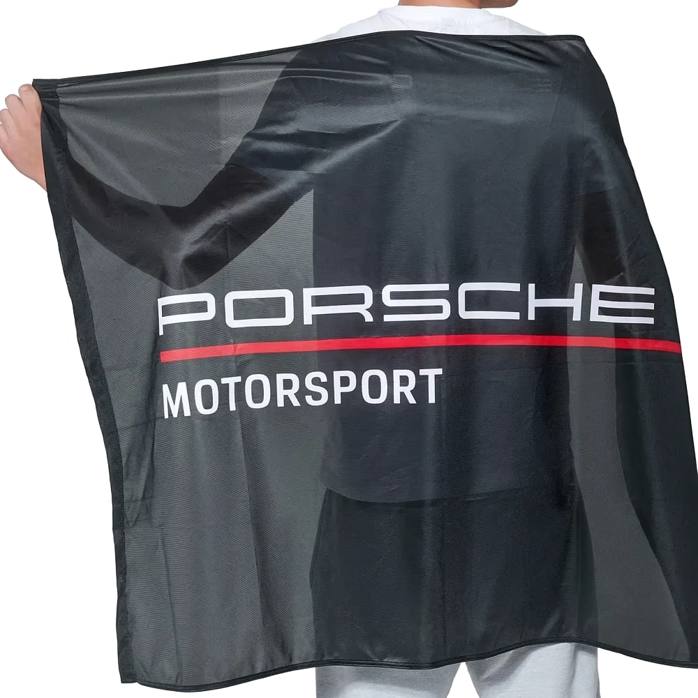 Black fan flag with “PORSCHE MOTORSPORT” signet.