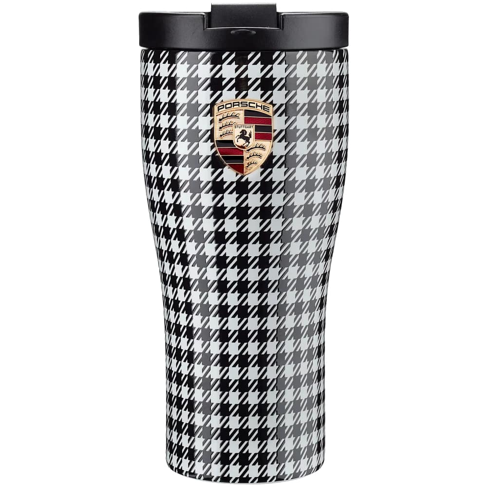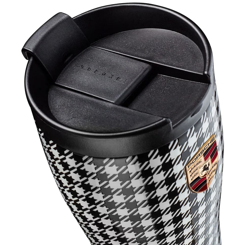 High performance to go, the double walled Porsche thermos cup in the exclusive Pepita design keeps hot beverages warm and cold beverages cool.