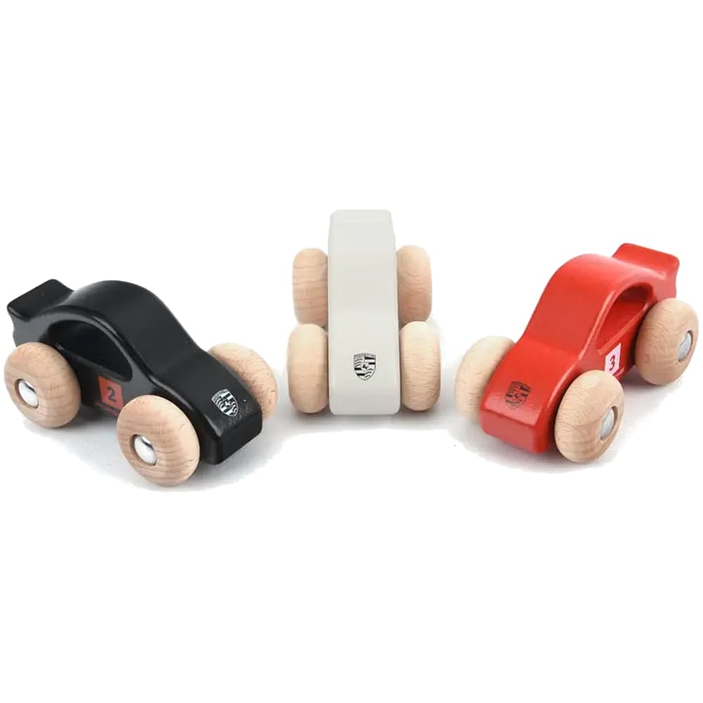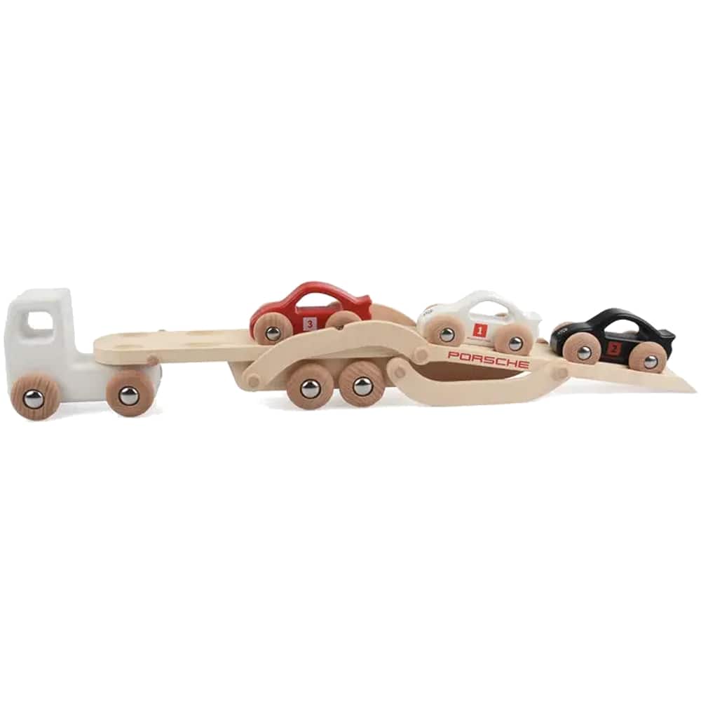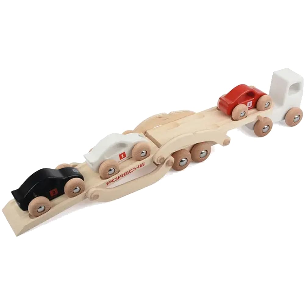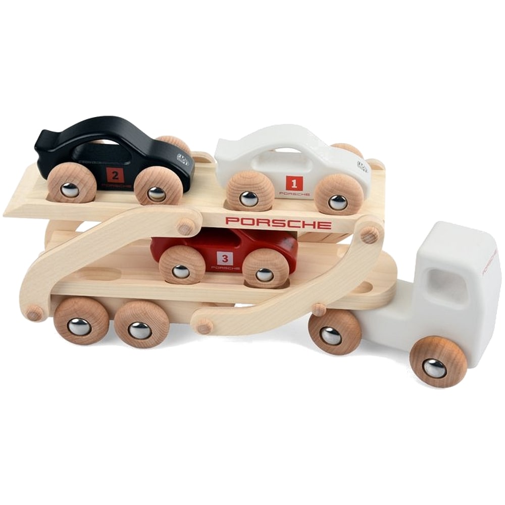 A 33 cm long wooden racing truck with a cab unit, a trailer and three racing cars in the Porsche Motorsport colours of red, white and black.