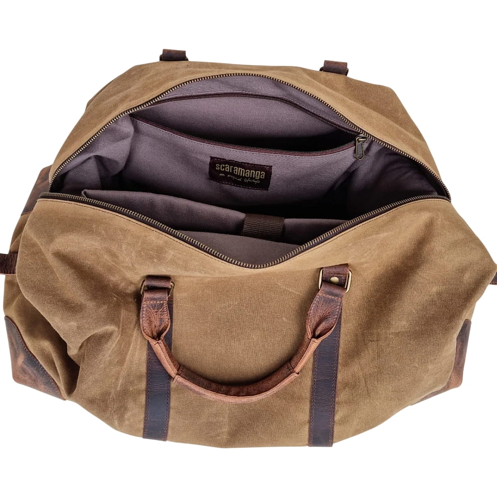 A spacious leather and canvas duffle bag. Take this classic waxed canvas and leather duffle bag on your next weekend away or, take it with you as hand luggage for your next long haul adventure or use it for a weekend away.